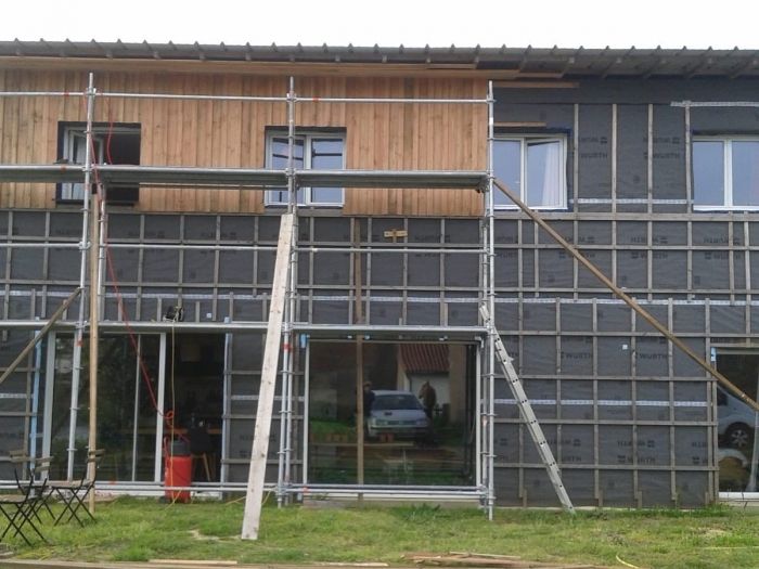 Auto construction d'une maison ossature bois, isolée en paille et enduit terre/paille. Bardage bois extérieur. 100 % Autonome en eau et électricité.