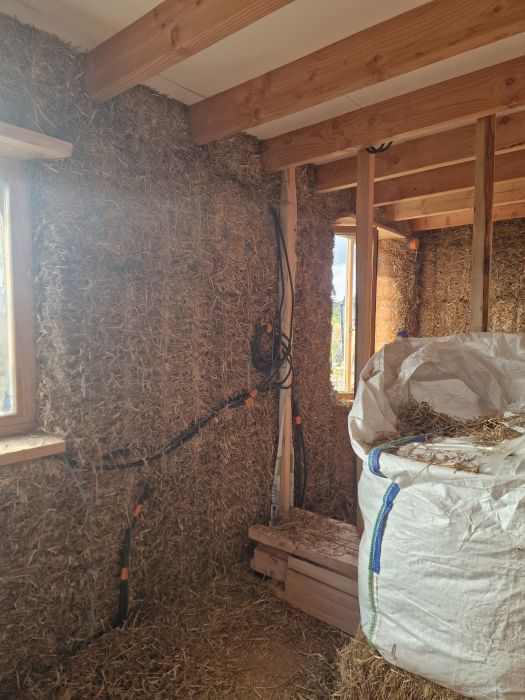 - 30 juin au 17 juillet préparation chantier enduits terre : finitions paille, passage de l'électricité, construction des cloisons en ossature bois avec support pour le torchis