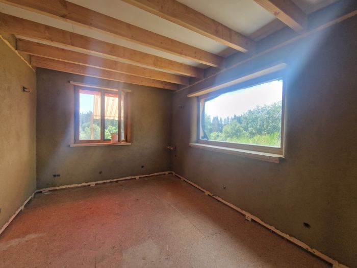 Perdus en pleine nature avec les renards, chevreuils et cerfs pour voisins, nous habitons depuis février 2022 avec mes deux ados, sur le terrain où se situe la maison. D'abord dans deux mobil-homes, nous avons emménagé à l'étage de la maison début janvier !!! OUI OUI, fini l'étage, bienvenue le confort d'une maison bien isolée et chaleureuse !