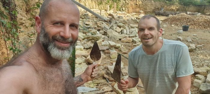 La construction à commencé mais sera longue. En effet, je bâti en pierres locales issues de mon terrain (Granit) et en terre de mon terrain également. De la chaux est ajoutée pour créer un liant. La construction est semi enterrée, (mur nord enterré) et la façade sud en baies vitrée avec une serre sur toute la longueur (principe des earthship) mais avec un principe de maison MAD (Maison Autonome Durable) basé sur l'inertie thermique grâce aux très épais murs de pierre.
