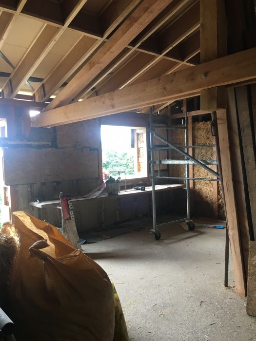 Nous avons fait le choix de l’isoler en paille selon la technique du GREB, une technique très accessible pour les auto-constructeurs avec des enduits terre intérieurs et un bardage bois extérieur.