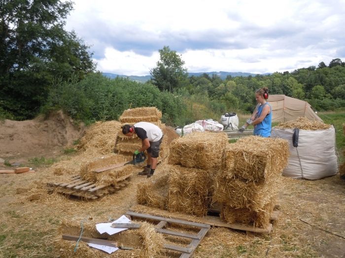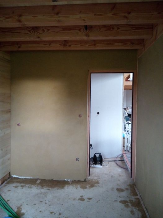 Où nous avons isolé 2 façades en bottes de paille, mis le corps d'enduit en terre sur la paille, fait les cloisons en terre paille, le mur chauffant et le bardage.