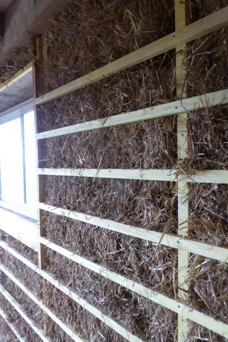 La maison a une structure en poteaux poutre et l'isolation du toit et des murs est en paille, le plancher du rdc quand à lui sera isolé en ouate de cellulose. La maison à été érigée sur des poteaux en béton. Le bardage est en bois pose verticale type "agricole". Les murs, cloisons et parement intérieur seront en bois, fermacel, enduit terre, et briques de terre cru.