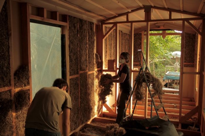 Assemblage des murs et d’un solivage en ossature bois, charpente, pose des menuiseries, isolation en laine de chanvre en vrac et terre paille, plomberie, électricité, pose d’un pare-pluie et d’un pare vapeur, pose de bardage intérieur/extérieur, pose d’un revêtement EPDM en prévision d’une toiture végétalisée, pose d’un parquet en châtaignier massif de récup’, aménagement intérieur et finitions …