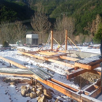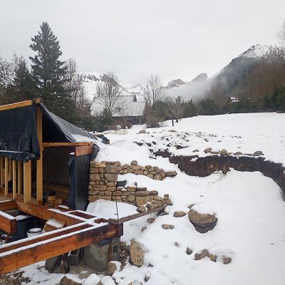 A 50m de ma maison actuelle, où je vous accueille, en bordure du hameau (au delà ce sont les chamois et les chevreuils qui résident). La maison sera en partie posée sur une base maçonnée, en partie sur micros pieux, supportant une dalle bois.