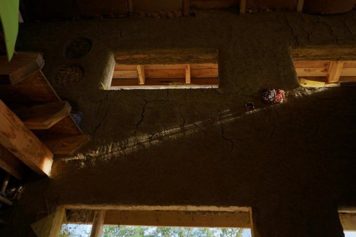 Nous avons commencé les enduits de corps en terre à l'intérieur, nous ferons des enduits en terre aussi à l'extérieur et à la chaux cote Ouest. Il nous reste aussi à finir le remplissage des cloisons de bambou en torchis (avec incrustation de bouteille de verre et de bois corde), l'isolation sous toiture, l'installation de parquet...