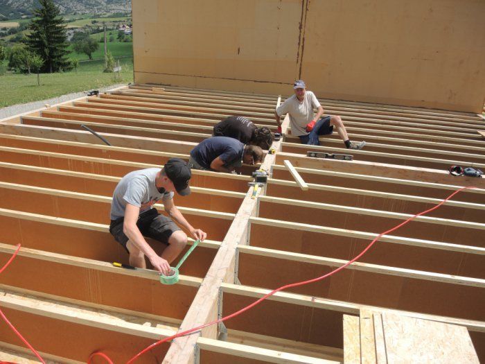 Chantier en auto-construction assisté par des professionnels de la construction paille.