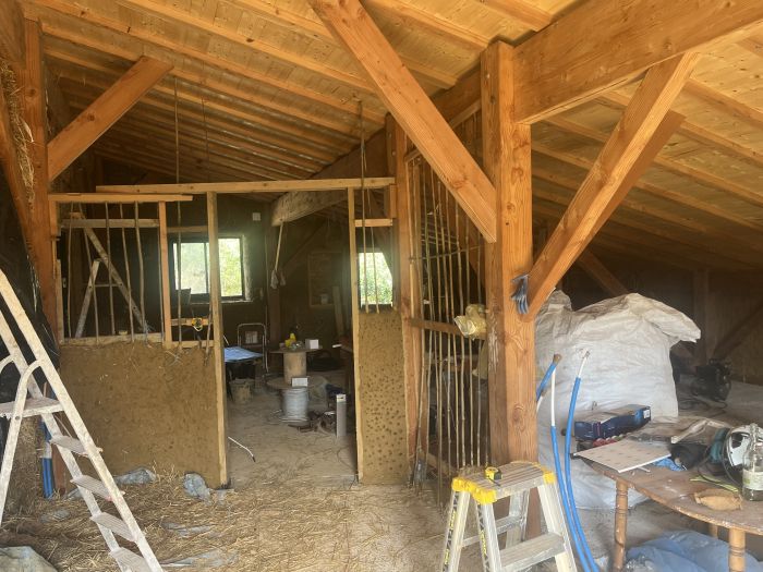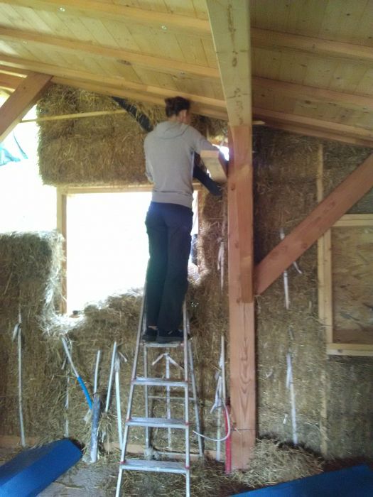 Nous sommes accompagnés par Eddy Fruchard (https://fr.twiza.org/member/1824/eddy-f.) qui a beaucoup d'expériences en construction paille. Avec son équipe, il vont nous faire la charpente. On va un peu aller les aider dans leur atelier.