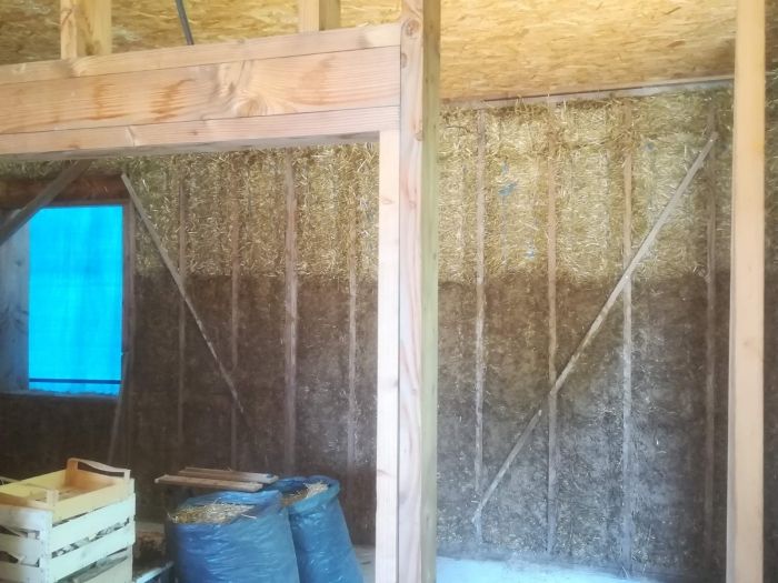 Certains espaces difficiles à remplir avec des morceaux de bottes seront bouchés avec un « mortier » à base de paille, chaux hydraulique et sable.