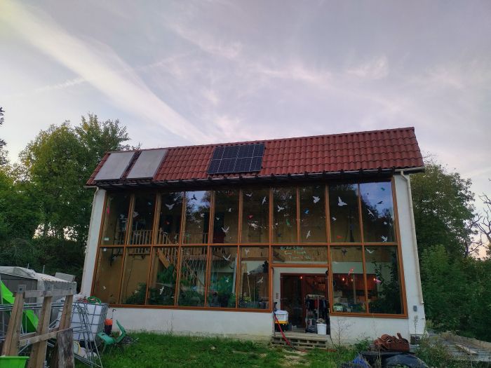 La filtration des eaux grises est faite par les plantes (pour alimenter la chasse d’eau), et nous avons mis en place quelques panneaux solaires thermiques et photovoltaïques, un chauffage par poêle bouilleur à bûches, des grandes citernes de récupération de l’eau de pluie pour tous les usages de la maison, et tout un tas de choses qui rendront la vie douce sans impacter trop fort notre environnement.