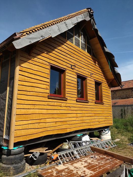 06/2025 : Enduits chaux extérieurs et début du bardage en châtaignier