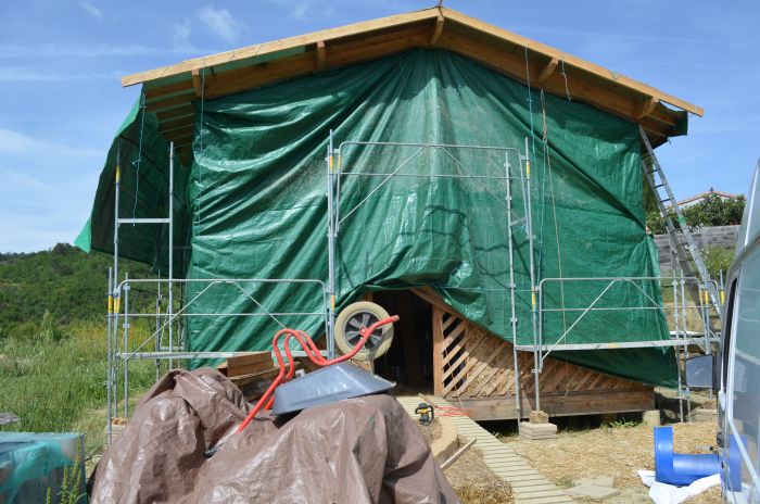 - Isolation du toit en bottes de paille, pose de l'Agepan et pare-pluie souple