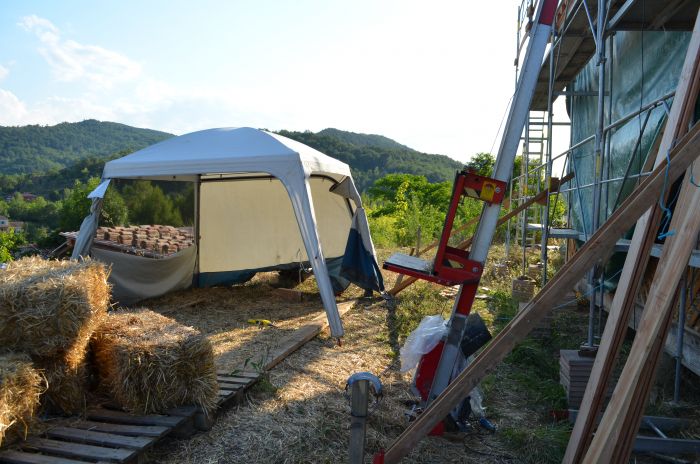 L’isolation des murs du rez-de-chaussée et du 1er étage est en bottes de paille. A l'extérieur, elles seront recouvertes de torchis et enduites d’un complexe terre-chaux. A l'intérieur, elles seront recouvertes de torchis, d’un enduit de corps en terre (étanchéité à l’air) et d’un enduit de finition (variable selon les pièces).