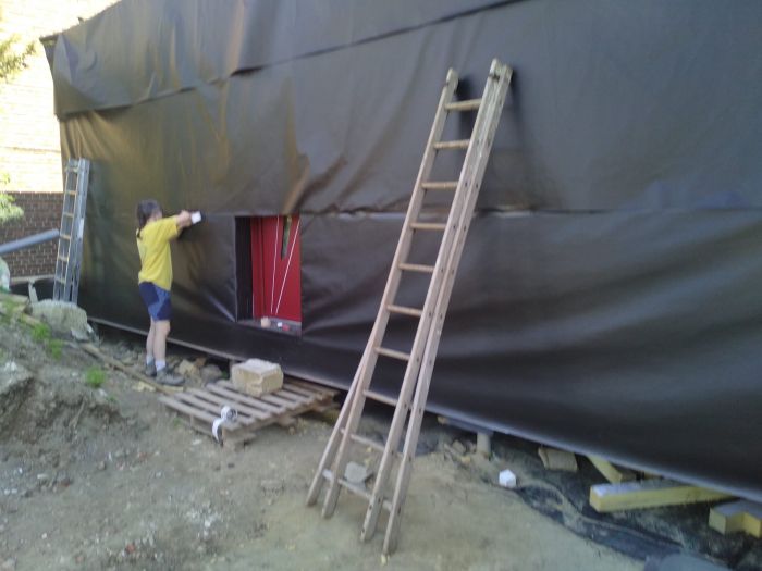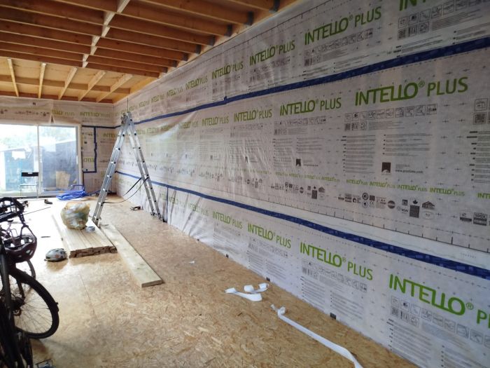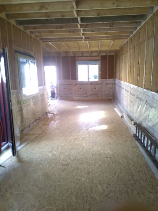 Nous construisons une maison de plain pied, en ossature bois et toiture plate. C’est une maison en kit : l’ensemble de l’ossature était déjà en planches pré-découpées, les sabots étaient déjà cloués,... nous avons un plan et une notice de montage à suivre. Nous avons posé une isolation extérieure en fibre de bois et intérieure en laine de bois. Nous prévoyons des cloisons intérieures en briques de chanvre et un enduit terre-paille.