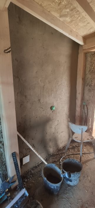 Cet enduit sera fait avec la terre du terrain qui a été creusée pour les fondations. Il est donc économique, écologique (bilan énergétique très favorable), laisse respirer les murs et absorbe l'humidité, facile à apprendre et à appliquer, agréable au toucher et 100% recyclable, bref presque que des qualités si ce n'est qu'il résiste mal aux intempéries sans protection et demande de l'entretien. La couche d'accroche a été appliquée au mois d’août dernier. Nous ferons donc la couche de corps (3 ou 4 cm) sur chaque mur intérieur.