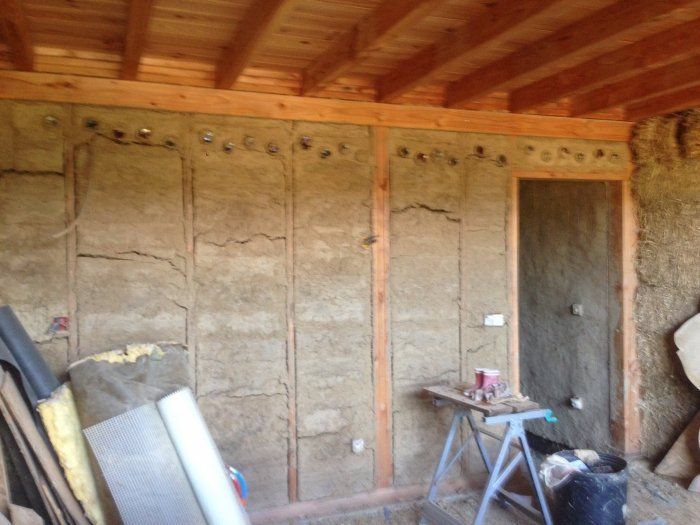 plancher en terre damé, l'enduit de corps en terre interieur et l'enduit de finition exterieur et interieur en terre et à la chaux.
