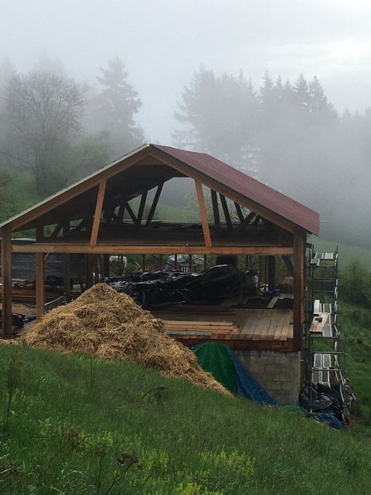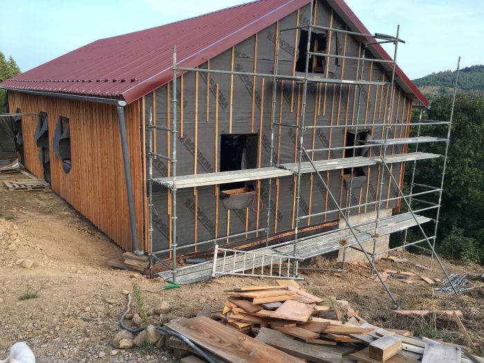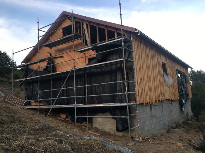 Le toit est posé et nous avons commencé les murs en paille, le contreventement et le bardage étant posé pour les parties nord et sud.