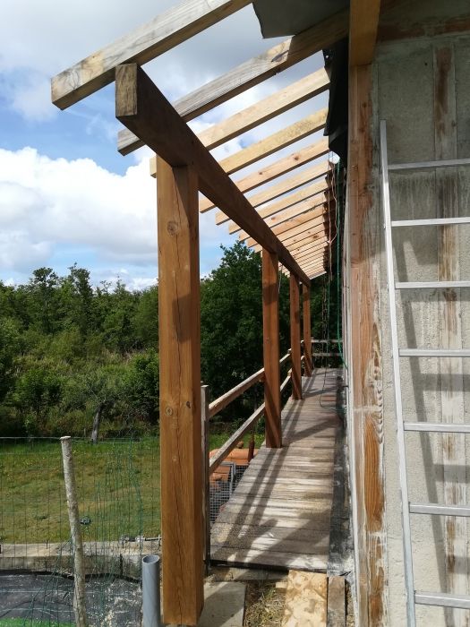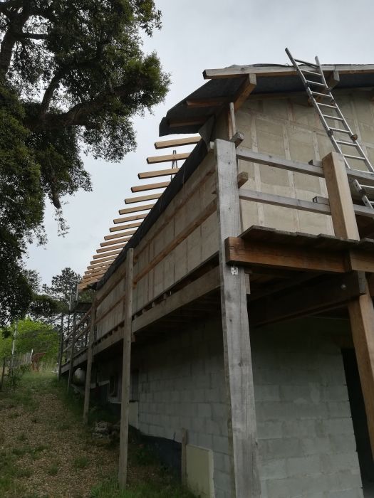 Au programme en mai/juin: pose de charpente en terrasse sur avancée de toit, pose des chevrons en débord de toit, pose des bandeaux de rive de toit, pose des liteaux à tuile et pose des tuiles. En juillet pose des précadres de fenêtre puis pose des menuiseries extérieures
