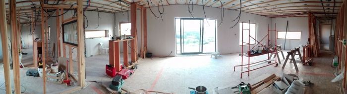 Viendra ensuite la pose d'un pare pluie souple sur les murs à l'extérieur, d'un pare vapeur à l 'intérieur, le cloisonnement intérieur pour définir les pièces, l' isolation (laine de bois et ouate de cellulose), le bardage, l'électricité, plomberie, pose d'un chauffe eau solaire, etc.
