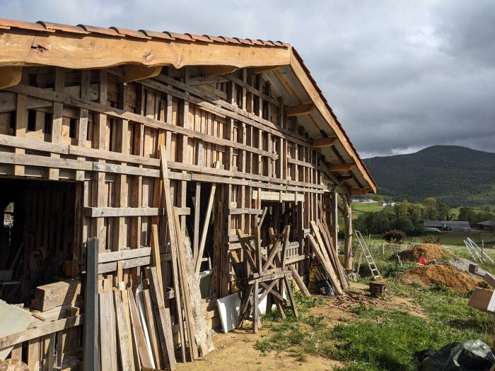 Nous avons cette démarche dans un but de réemploi mais aussi car ça va bien avec notre petit budget, pour exemple le premier batiment de 100m² au sol (50m² habitable) nous a coûter moins de 6000€ tout compris.