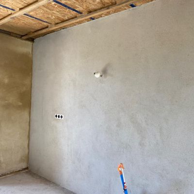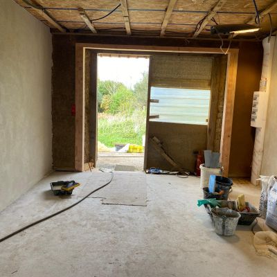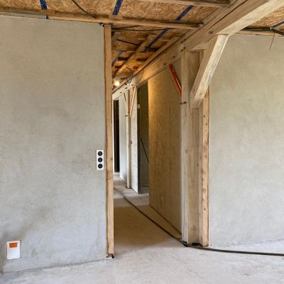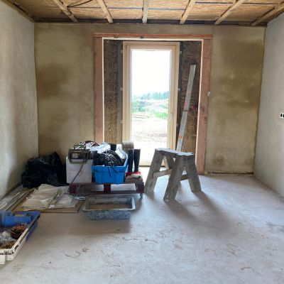 On poursuit actuellement le 2nd œuvre : étanchéité des fenêtres, pose des volets et porte de garage, plafond en lame de peuplier, douche à l'italienne... il reste encore pas mal de choses à faire!