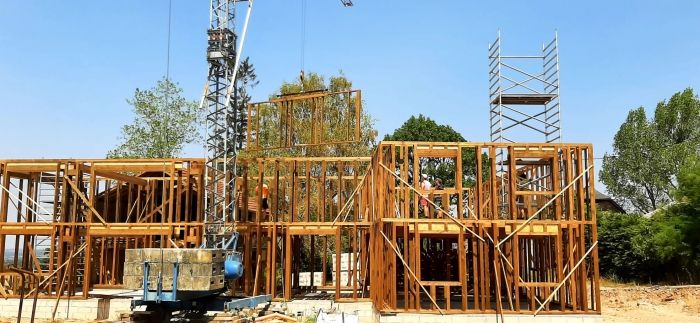 La double ossature bois est réalisée en Douglas (du Cantal) et l’isolation en paille (du Lot). Le tout sera enduit à la chaux.