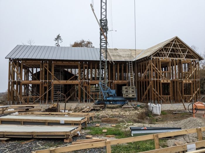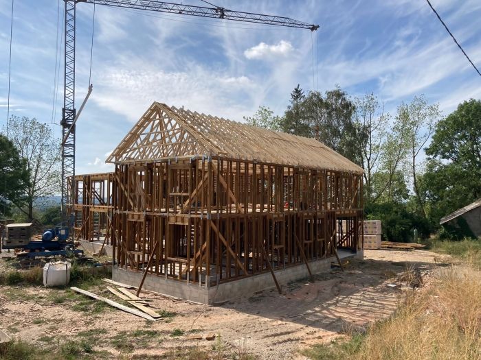 Nous construisons selon la technique GREB une maison à un étage et combles perdus. C’est un très gros chantier (environ 250m²) puisque nous devons respecter l’emprise au sol et le volume de l’ancienne maison d’habitation (à cause du PLU).