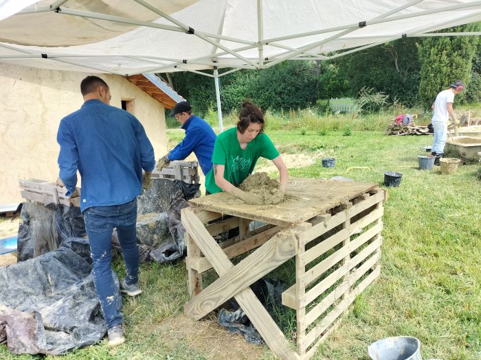 Au cours des 5 chantiers de l'été dernier nous avons accueilli 25 personnes qui nous ont aidé à réaliser les fondations, les murs, tout les enduits de corps extérieurs et le toit.