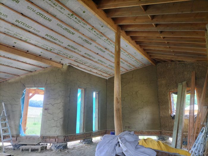 Au mois de mai 2023 nous avons démarré la construction de notre future maison de 104m2 en terre/paille d'après la technique CST (Cellule Sous Tension) : paille isolante et porteuse.