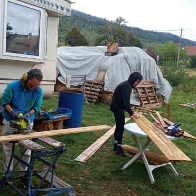 Nous sommes Mike et Lulu, arrivés depuis à peine un an dans le Bugey pour y construire la vie dont on rêve. Nous avons acheté une prairie d’½ hectare et nous nous y installons progressivement. L’année passée nous a permis un jardin qui fournit déjà tous nos légumes et nous avons retapé un grand mobilhome pour y vivre le temps des travaux.