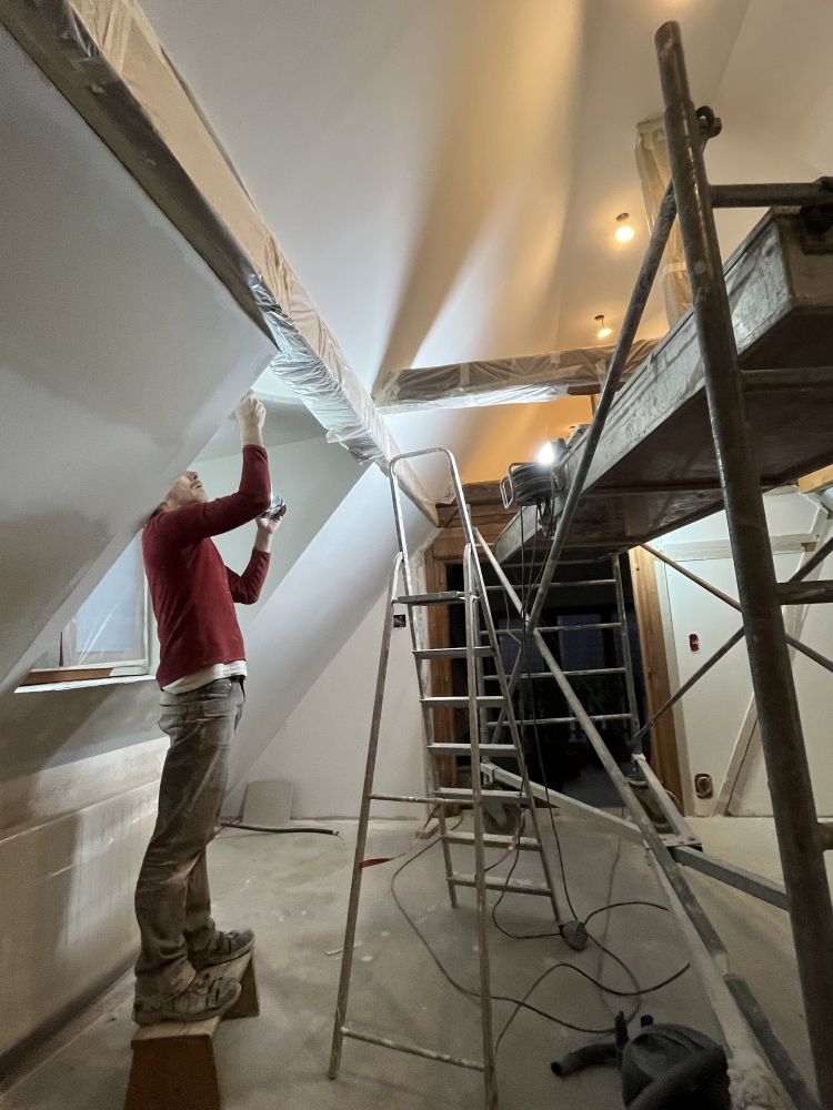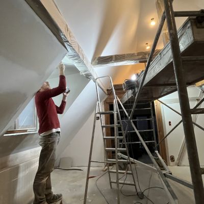 Petit à petit, nous avançons l'isolation des combles : nous avons opté pour de la laine de mouton entre chevrons et de la fibre de bois en deuxième...