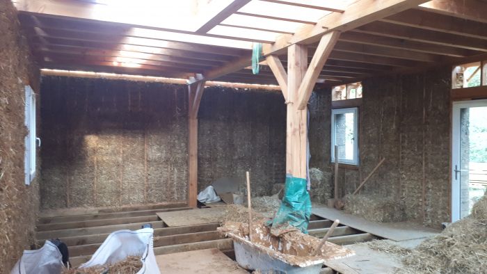 1ere et 2ème semaine : nous remplissons les murs en paille. Les bottes sont trempées dans une barbotine avant d’être posées. L'interface entre l’étage et le rdc se fera avec un mélange de terre paille.