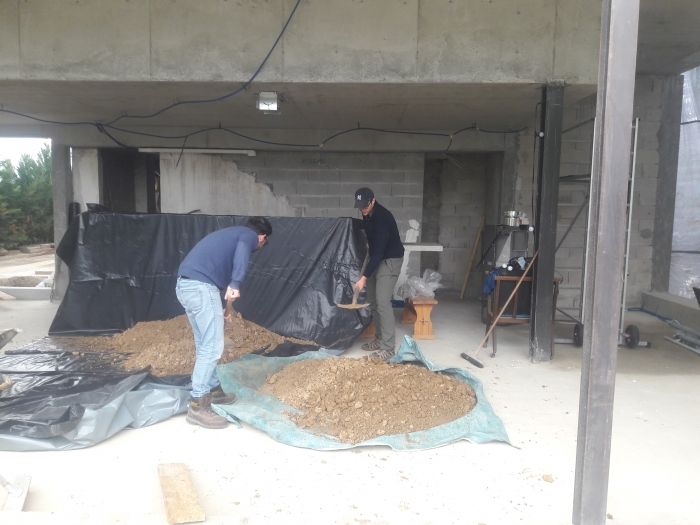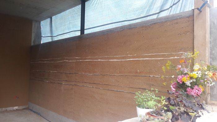Une fois que le pisé est bien lancé en fin de semaine nous lancerons la préparation d'un corps d'enduit à partir de la terre de site pour réaliser la première couche d'enduit sur le mur en parpaing.