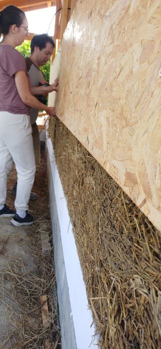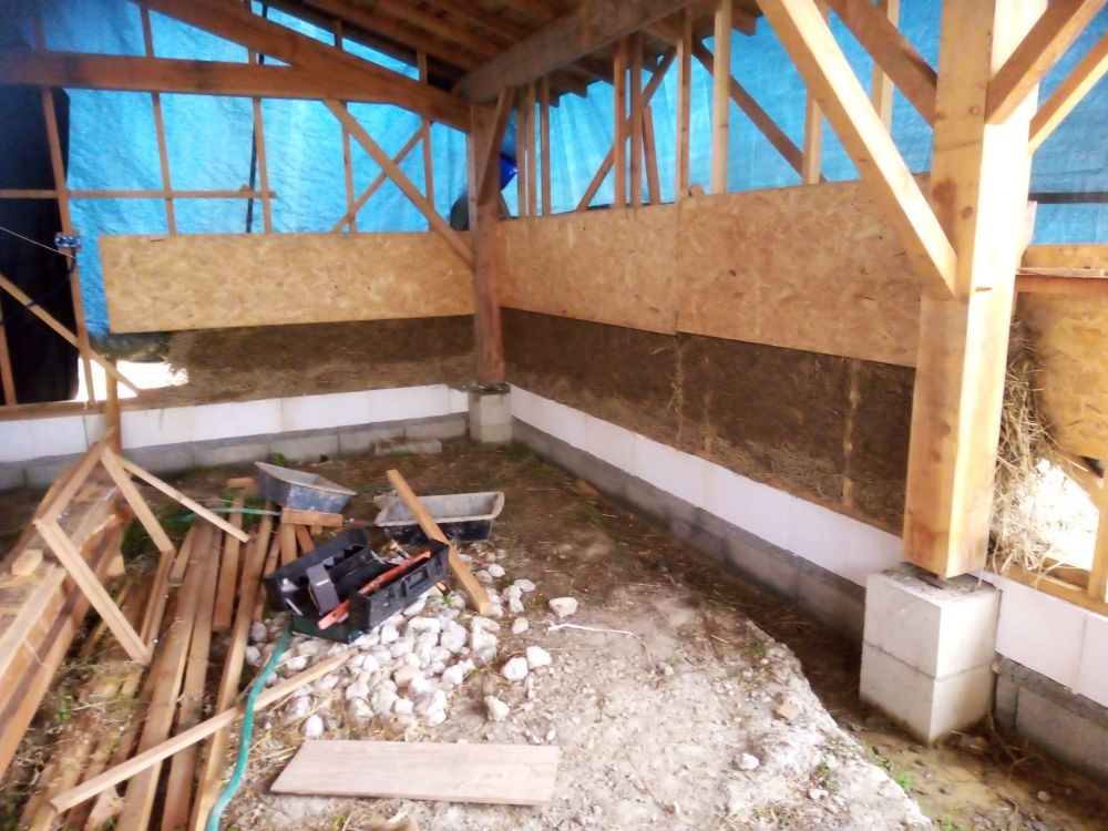 Les murs sont prévus en Terre-paille. De la paille aspergée de barbotine de terre, que l’on mélange et que l’on banche pour faire les murs. Cette étape est très gourmande en main d’œuvre, et met très longtemps à sécher, donc nécessite d’être mise en œuvre l’été uniquement.