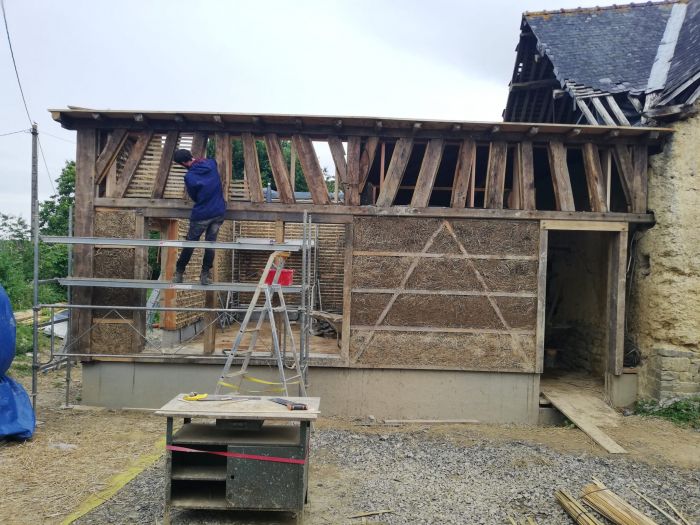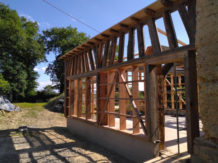 Après une phase de déconstruction (découverture, dépose de charpente) de nouvelles fondations ont vu le jour, et actuellement le charpentier et son équipe s'active sur l'ossature bois qui sera prête d'ici la semaine prochaine ... il sera temps ensuite de remplir les murs !