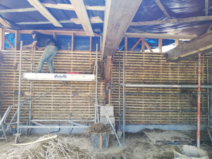 La maison est une ancienne dépendance de ferme découpée en 2 parties : une partie avec des murs en bauge et une autre partie que nous reprenons en quasi-totalité avec une ossature bois et remplissage terre-paille.