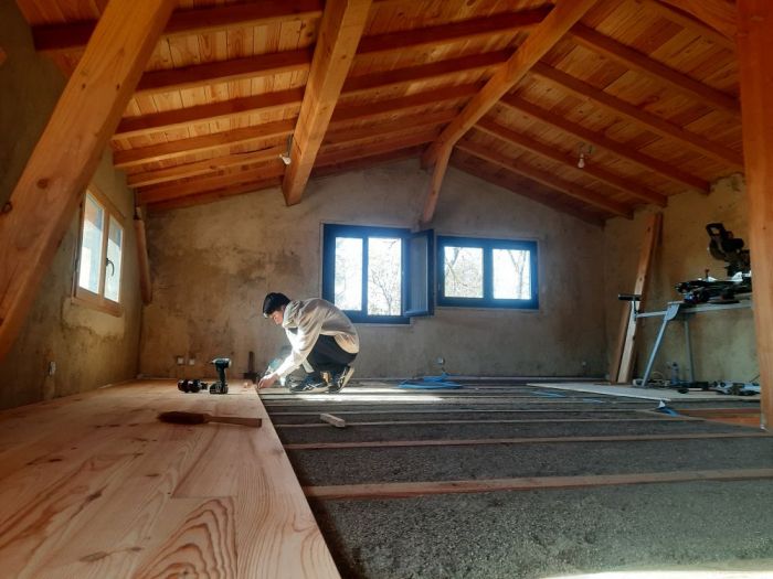 La dalle en bois de la maison repose sur des pieux métalliques vissés dans le sol. La charpente, constituée de 3 fermes, est en douglas. Nous l’avons sciée à la fin de l’été 2022, et elle a été levée à l’automne. Le toit, isolé en paille, est couvert depuis décembre.