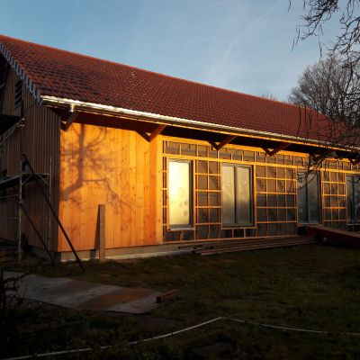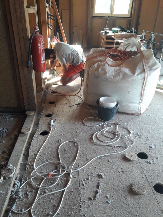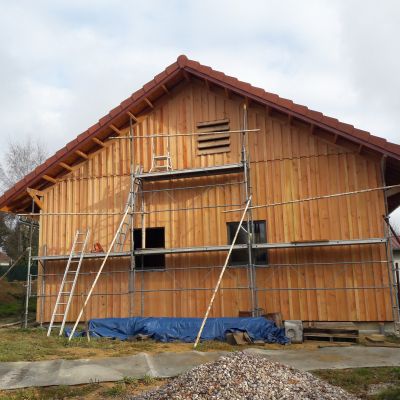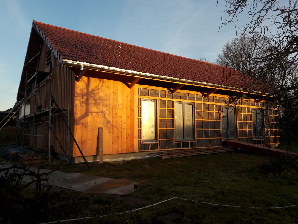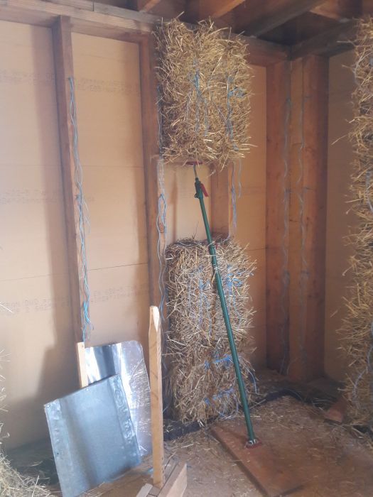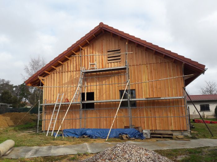 Le chantier a démarré en juillet 2024, en août 2025 nous sommes hors d'eau / hors d'air, et on attaque le second œuvre (isolation (paille et laine de bois), remplissage des cloisons, puis gaines élec et plomberie, VMC, etc.).