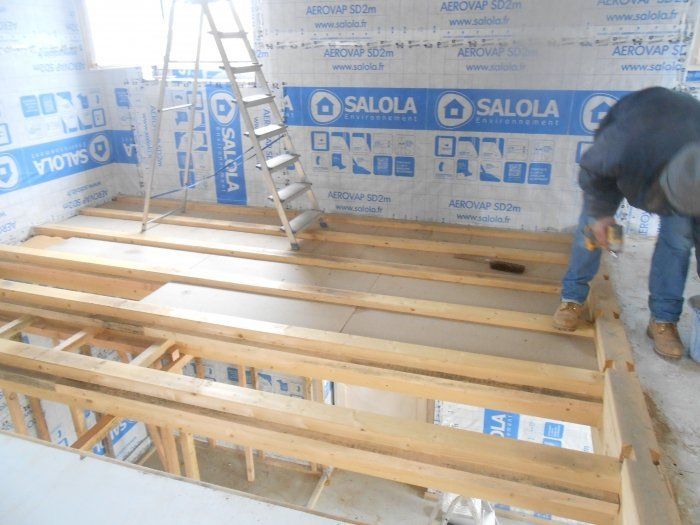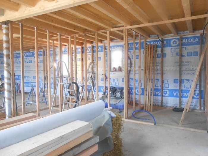 Nous avons choisi de doubler les murs extérieurs afin d'y passer plus facilement les réseaux que dans la paille, et ainsi générer le moins de traversées par les réseaux du frein vapeur. L'étanchéité à l'air dubâtiment n'en sera que meilleure !