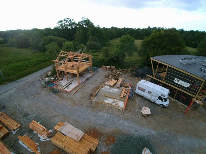 Fabrication, assemblage d'une ossature bois sur le système poteaux poutre conçue par notre maitre d'oeuvre pour notre maison commune de notre habitat groupé (cette maison nous servira à faire des fêtes de famille, nos réunions, etc...)