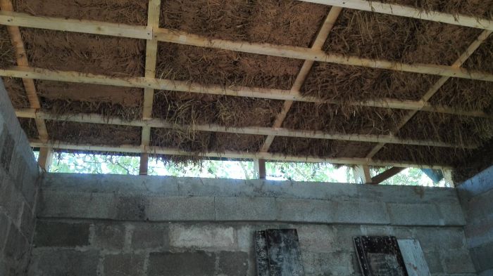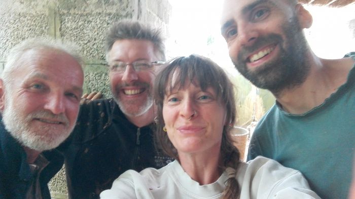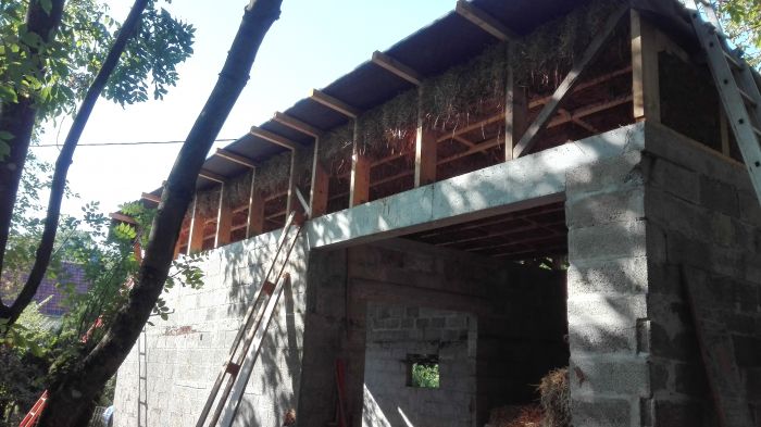 Bienvenue sur le chantier de notre garage à partager! Dans le cadre de la ferme des ****** ( nom tenu secret, on est là incognito) nous rénovons un bâtiment pour en faire un garage partagé, le principe une fois fini ? Tu te pointes avec ta caisse et François t’aide (sans être un professeur) à faire la vidange, l’entretien, trouver une panne… le tout dans la convivialité ! Bref tu deviens carrément plus autonome en mécanique quoi ! Mais on en est pas encore là. Pour l’instant nous avons remonté les murs écroulé et fait la charpente, isolée en ballot de paille. Nous devons encore recouvrir nos murs extérieur en terre/paille banchée, la technique n’a plus aucun secret pour nous et faire la première couche des enduits intérieur ce qui est aussi les doigts dans le nez mais c’est tellement plus sympa à plusieurs !