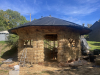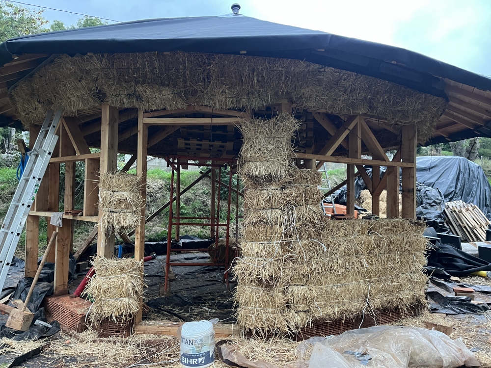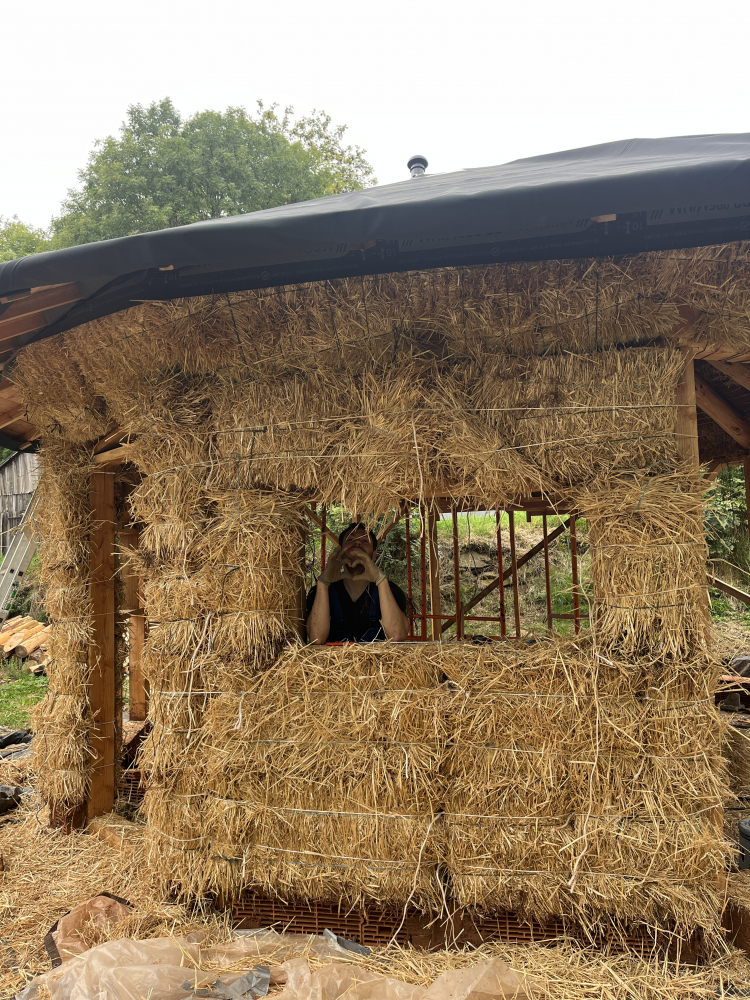 La paillourte fait 26m2, un tout petit projet. Elle se tient sur un hérisson ventilé, a une structure en bois (ossature et charpente), une isolation en paille avec diverses techniques (brocoli, CST) et des enduits terre/paille/chaux à l’extérieur et des enduits terre/paille à l’intérieur. Le plus gros est fait mais il reste les enduits, ce qui est le plus long mais aussi le plus reposant, méditatif et satisfaisant !