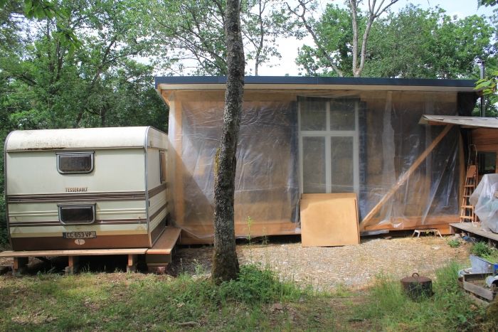 d’où l’installation de 2 caravanes et le projet de construire une pièce entre les deux en paille.