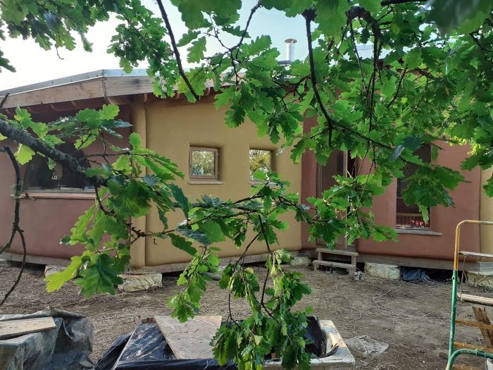 Bonjour, en 2020 nous avons fait le gros oeuvre de la première maison pour nous 3 (Ma femme,mon fils et moi) en terre paille et bois avec 2 hexagones.