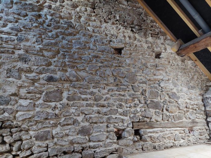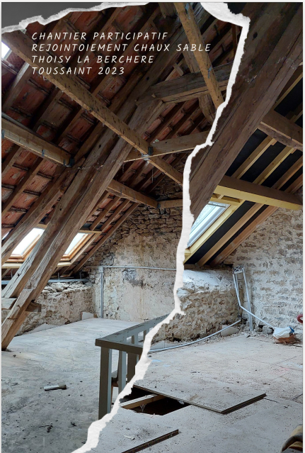 En 2023, les travaux portent sur le premier étage : démolition lambris, parquet ; charpente, rejointoiement, isolation fibre de bois …