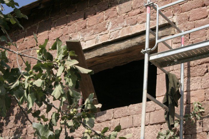 Avant d'attaquer le rehaussage des entrées, on retape le plancher de la grange en pierre : il s'agit d'enlever le plancher existant, de poser une poutre maîtresse (portique), de baster les poutres existantes pour la mise à niveau, de poser de la volige pour retenir l'isolant (ouate de cellulose) et enfin le parquet en chêne.