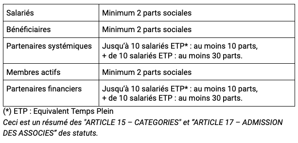 Une part sociale coûte 30€ et chaque catégorie nécessite un nombre minimum de parts sociales :