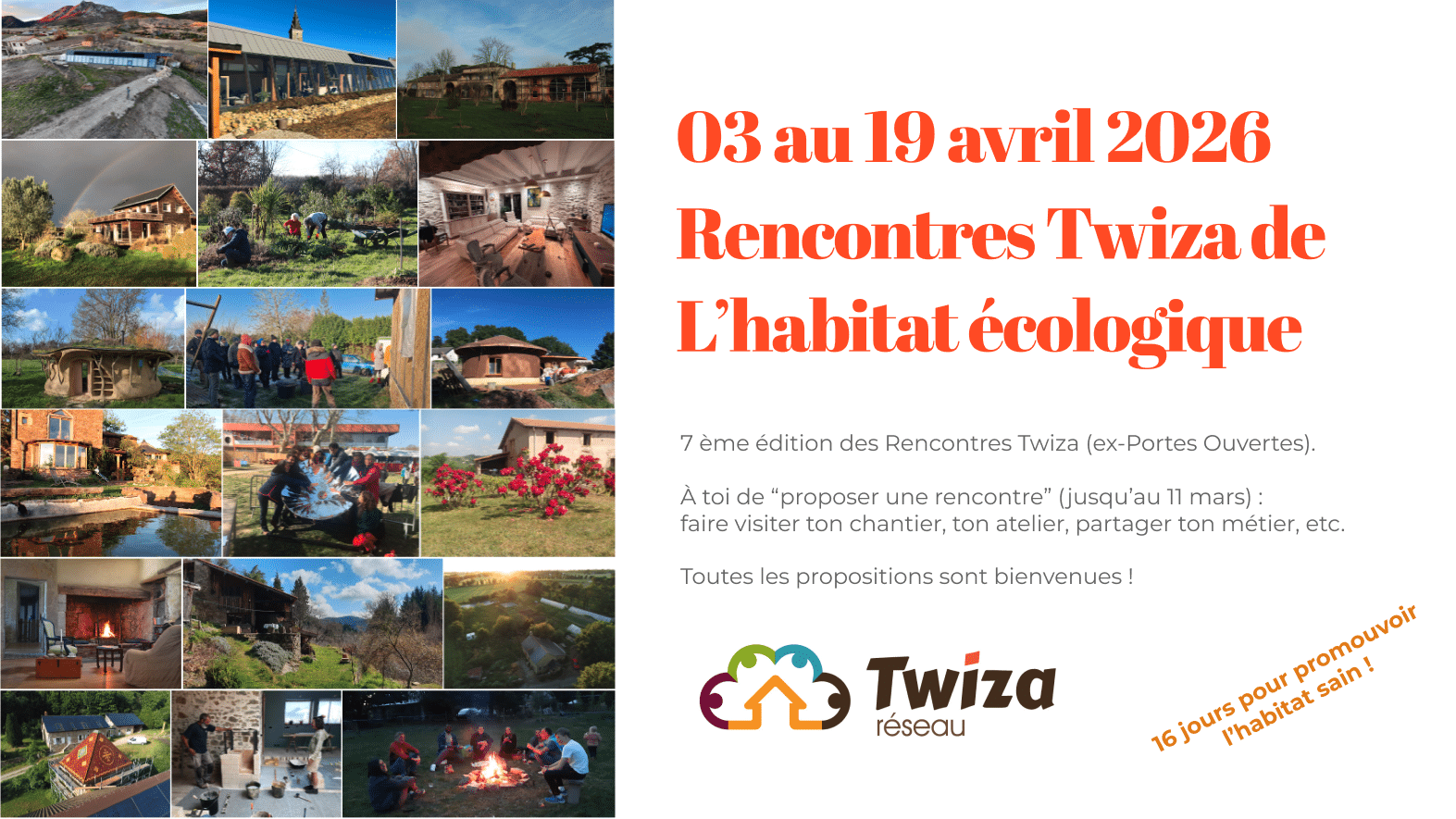 Du 03 au 19 avril se tiendra, partout en France, notre 7ème édition des « Rencontres Nationales de l’Habitat Écologique » : en ce moment, on accueille TOUTES vos propositions de rencontres partout en France.