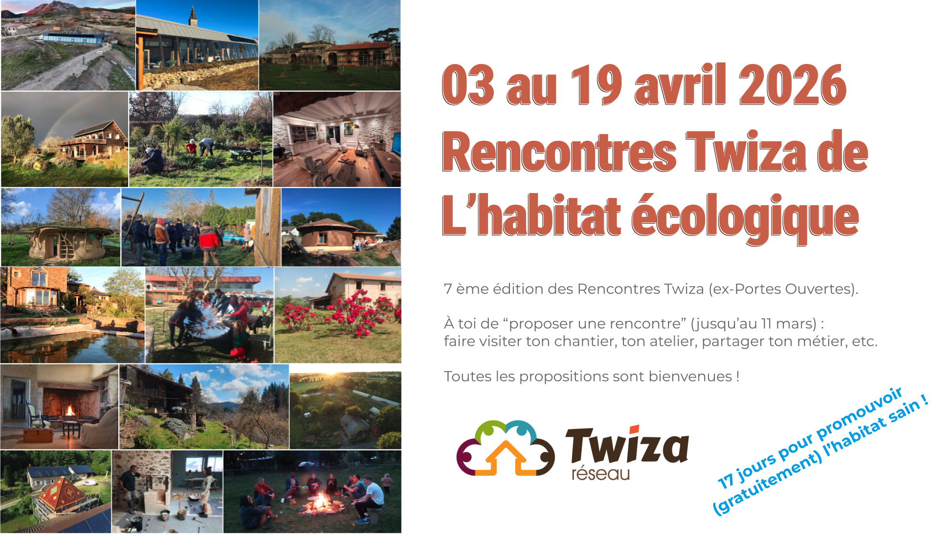 Du 03 au 19 avril se tiendra, partout en France, notre 7ème édition des « Rencontres Nationales de l’Habitat Écologique » : en ce moment, on accueille TOUTES vos propositions de rencontres partout en France.