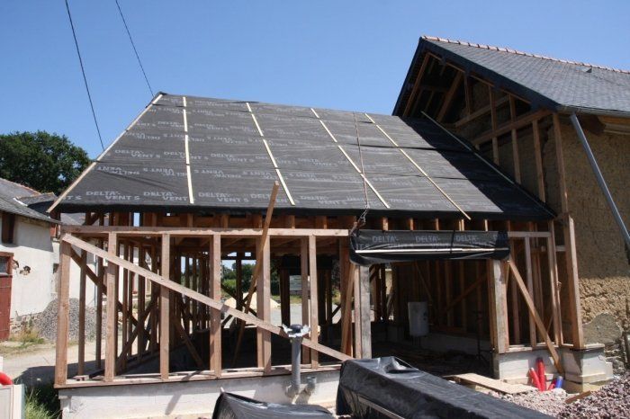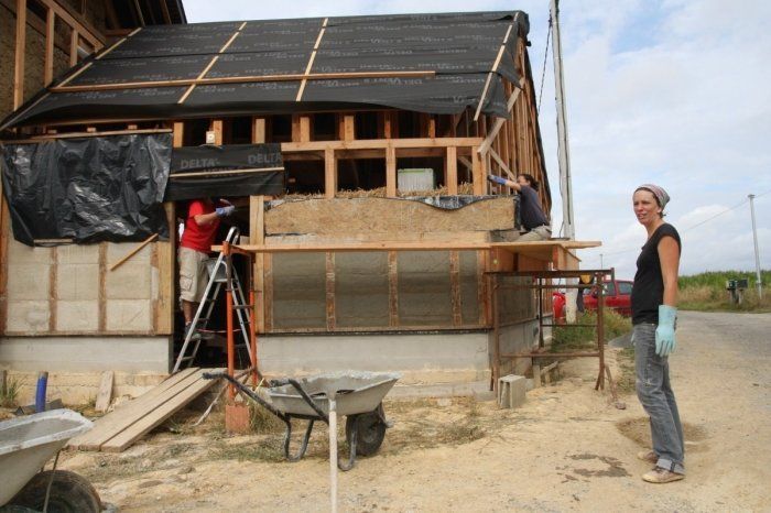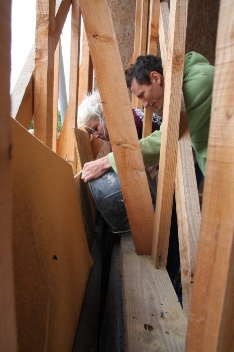 Remplissage de la double ossature bois avec des bottes de paille et coulage du mortier à l'avancée selon la technique GREB.